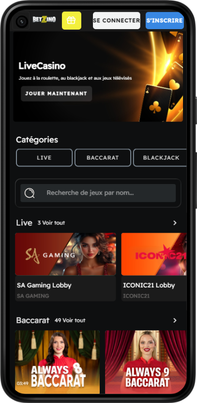 Notre application mobile BetZino download a été conçue par les meilleurs éditeurs, d’où la qualité du design et une expérience utilisateur unique. En effet, nos jeux casino sur BetZino download dispose d’une qualité sonore et d’un design qui vous plonge au coeur de la partie. Ces différentes qualités incluent aussi nos jeux live casino qui sont diffusés sur BetZino app.